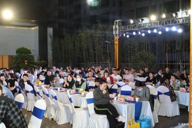 经销商晚宴当日晚6时许,以【乘“圣”跨越】为主题的,Z6·尊龙时凯集团第45届国际家具展接待晚宴暨2020年度优秀经销商颁奖盛典,在营销中心四楼景观花园隆重举行,来自全国各地的经销商朋友欢聚一堂,共同分享一场精彩纷呈的晚宴。
